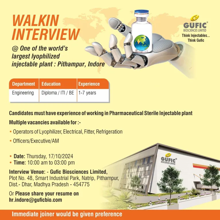 Gufic Biosciences Limited of industries is a fastest growing and leading company in Lyophilization injection, API facility. Gufic Biosciences Limited having accreditation of WHO and EU GMP. We are having below vacancies for Navsari (Gujarat) Plant. We, Gufic Biosciences Ltd is a leading Pharmaceutical company in Lyophilization injection at Navsari (Gujarat) and having accreditation of WHO and EU GMP PPB Kenya, Uganda, Ukraine, Canada etc.