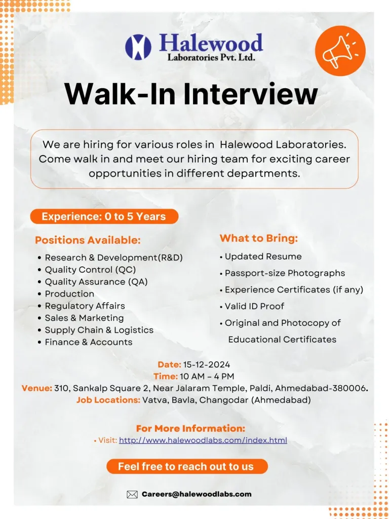 Halewood Laboratories Pvt. Ltd. is hosting a Walk-in Drive to fill multiple openings in various departments within the Pharmaceutical Industry. If you’re looking to grow your career with an innovative company that’s dedicated to improving healthcare, this is your chance to join a team that values excellence, dedication, and a passion for quality.