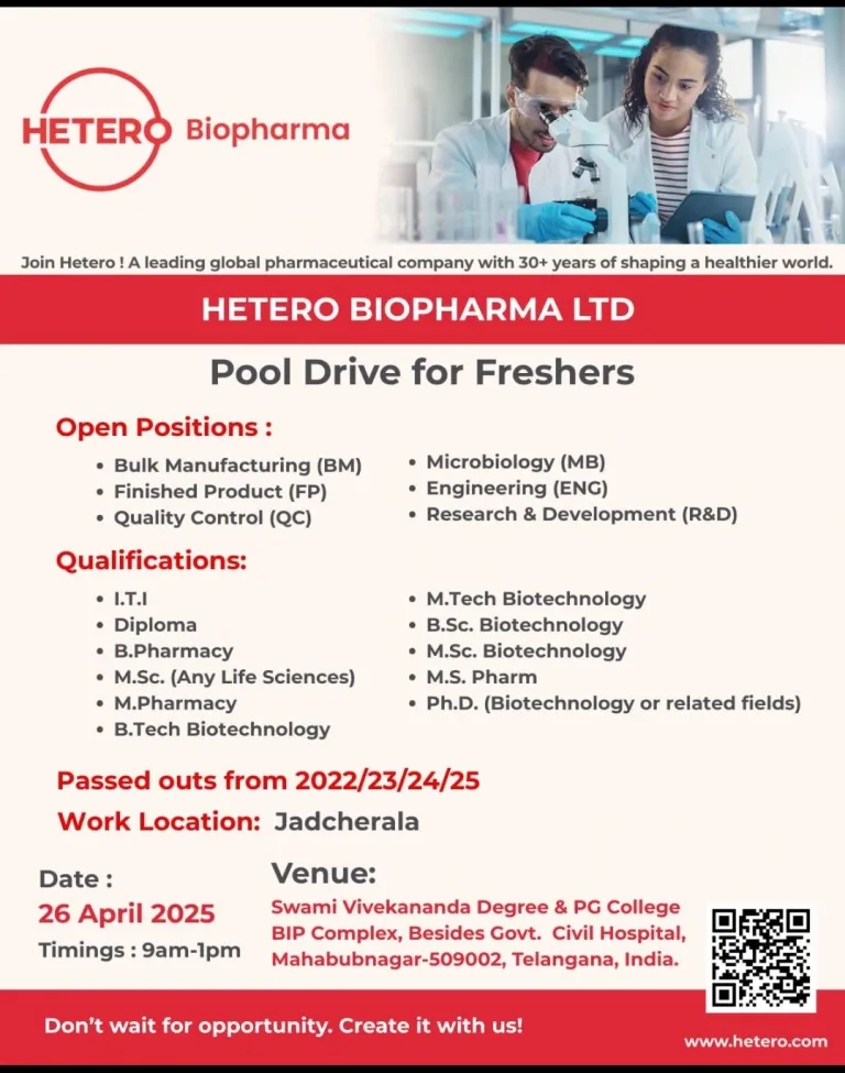 - M.Sc. (Life Sciences) | B.Tech/M.Tech (Biotechnology) / B.Sc. / M.Sc. Biotechnology | M.S. Pharm | Ph.D. (Biotech/related)