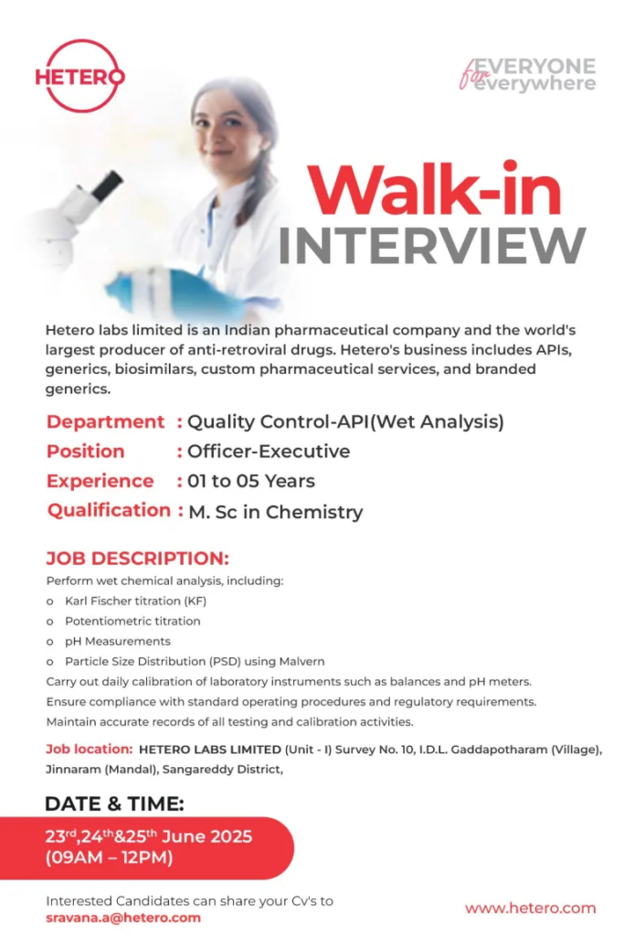 - Job location: HETERO LABS LIMITED (Unit-1) Survey No. 10, I.D.L. Gaddapotharam (Village), Jinnaram (Mandal), Sangareddy District,