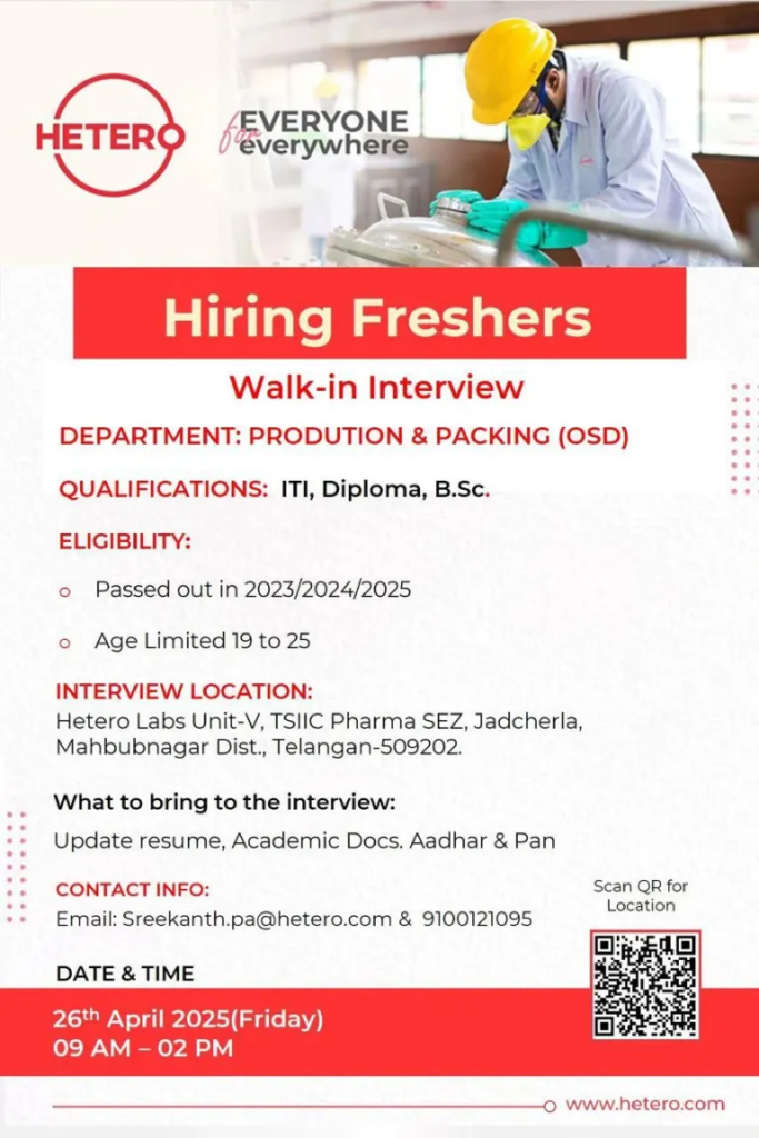 - INTERVIEW LOCATION: Hetero Labs Unit-V, TSIIC Pharma SEZ, Jadcherla, Mahbubnagar Dist., Telangan-509202.