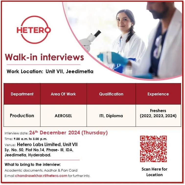 • Interview Venue: Hetero Labs Limited, Unit VII Sy. No. 50, Plot No.14, Phase- III, IDA, Jeedimetla, Hyderabad.