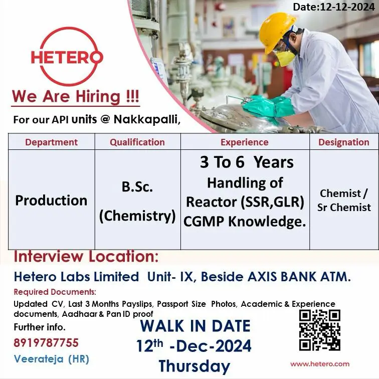- Walk-In interview location : Hetero labs limited (Unit-9) Unit- IX, Beside AXIS BANK ATM, Nakkapalle (Vizag).