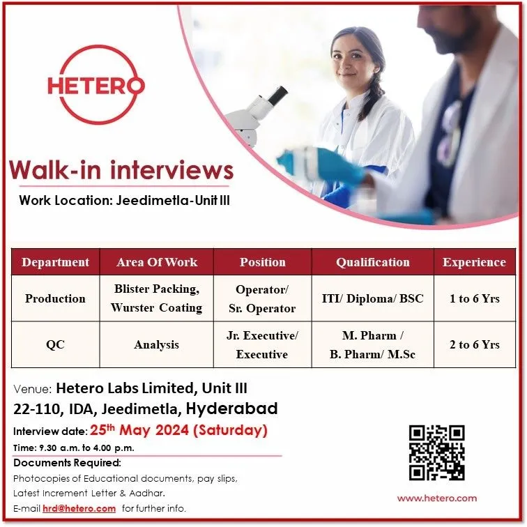 - Qualification: B.Sc, M.Sc, B.Pharm, M.Pharm, ITI, Diploma