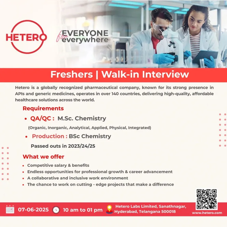 Hetero, a globally recognized pharmaceutical leader operating in over 140 countries, is opening its doors for a Walk-in Interview!