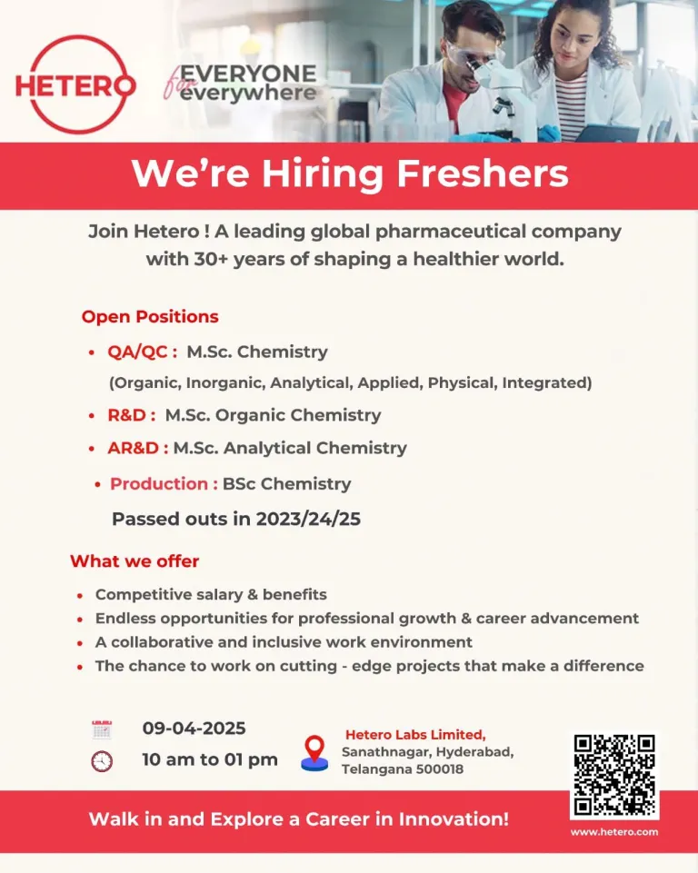 Greetings from Hetero Labs Ltd. Exciting Opportunity for Freshers in Chemistry. We at Hetero are hiring passionate and driven freshers to join our team and be a part of a leading global pharmaceutical company with 30+ years of shaping a healthier world.