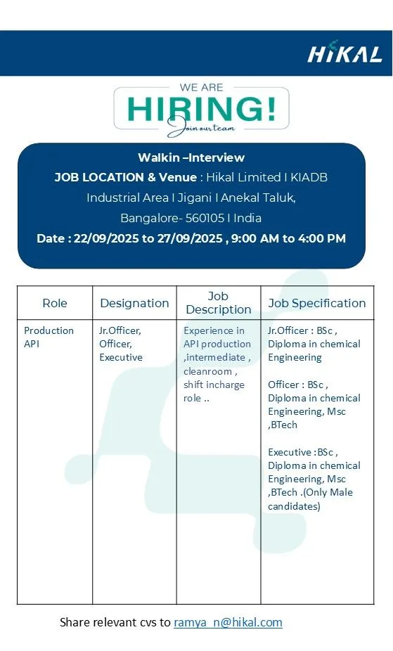 Venue: Hikal Limited ,Unit 1 82/A, KIADB Indl. Area, Jigani, Anekal Taluk, Bangalore – 560105