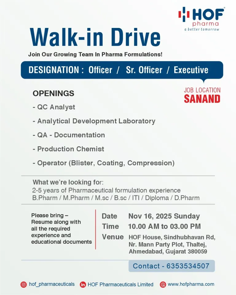 HOF Pharma has built a strong reputation in the pharmaceutical industry for its commitment to quality, innovation, and integrity. With cutting-edge manufacturing facilities and a highly skilled workforce, the company focuses on producing top-notch pharmaceutical products that meet global standards. As part of its growth strategy, HOF Pharma is now looking to expand its team across several key departments.