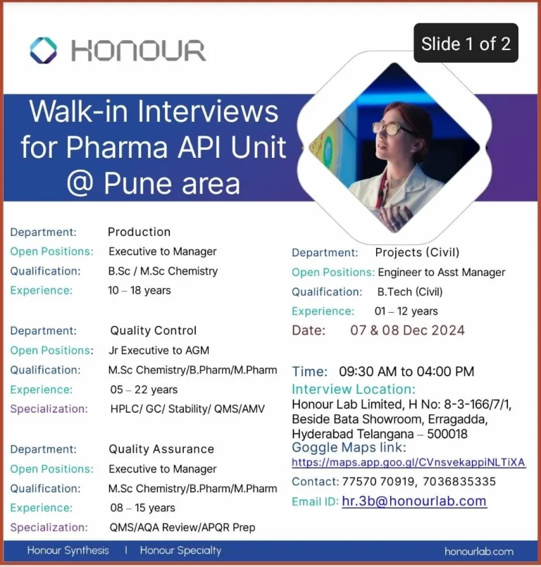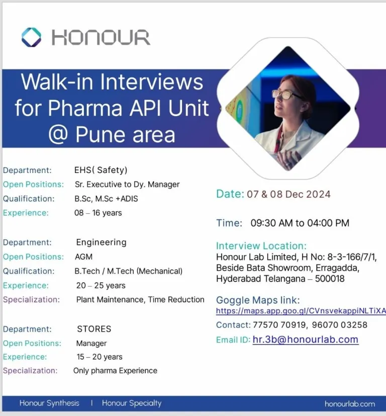 - Location: Honour Lab Limited, H No: 8-3-166/7/1, Beside Bata Showroom, Erragadda, Hyderabad Telangana – 500018