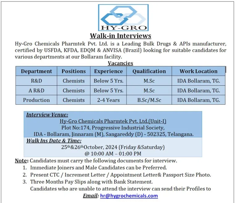 Candidates who are unable to attend the interview can send their Profiles to Email idhr@hygrochemicals.com