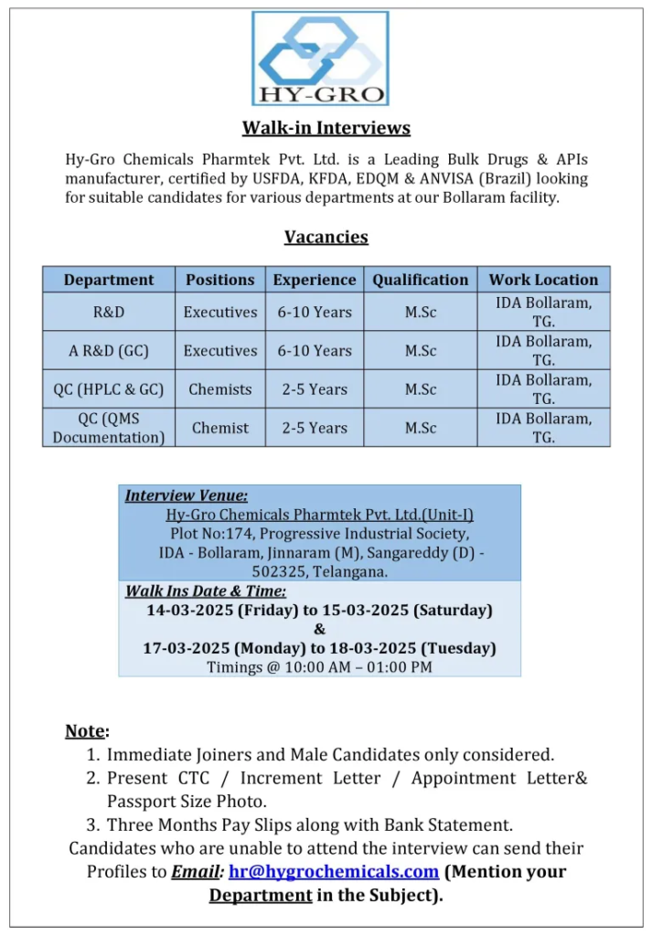 Candidates who are unable to attend the interview can send their Profiles to Email: hr@hygrochemicals.com (Mention your Department in the mail Subject)