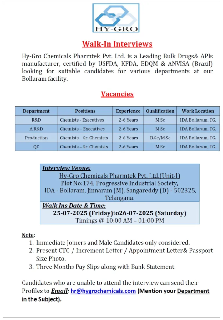 - Venue: Hy-Gro Chemicals Pharmtek Pvt. Ltd.(Unit-I) Plot No:174, Progressive Industrial Society, IDA – Bollaram, Jinnaram (M), Sangareddy (D) – 502325, Telangana, India