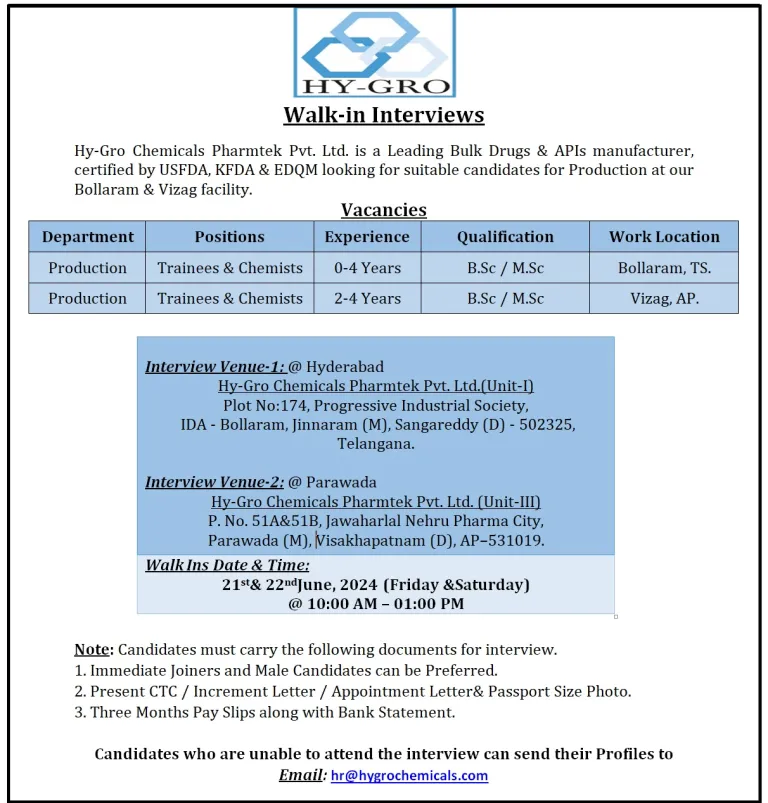 Candidates who are unable to attend the interview can send their Profiles to Email id: hr@hygrochemicals.com