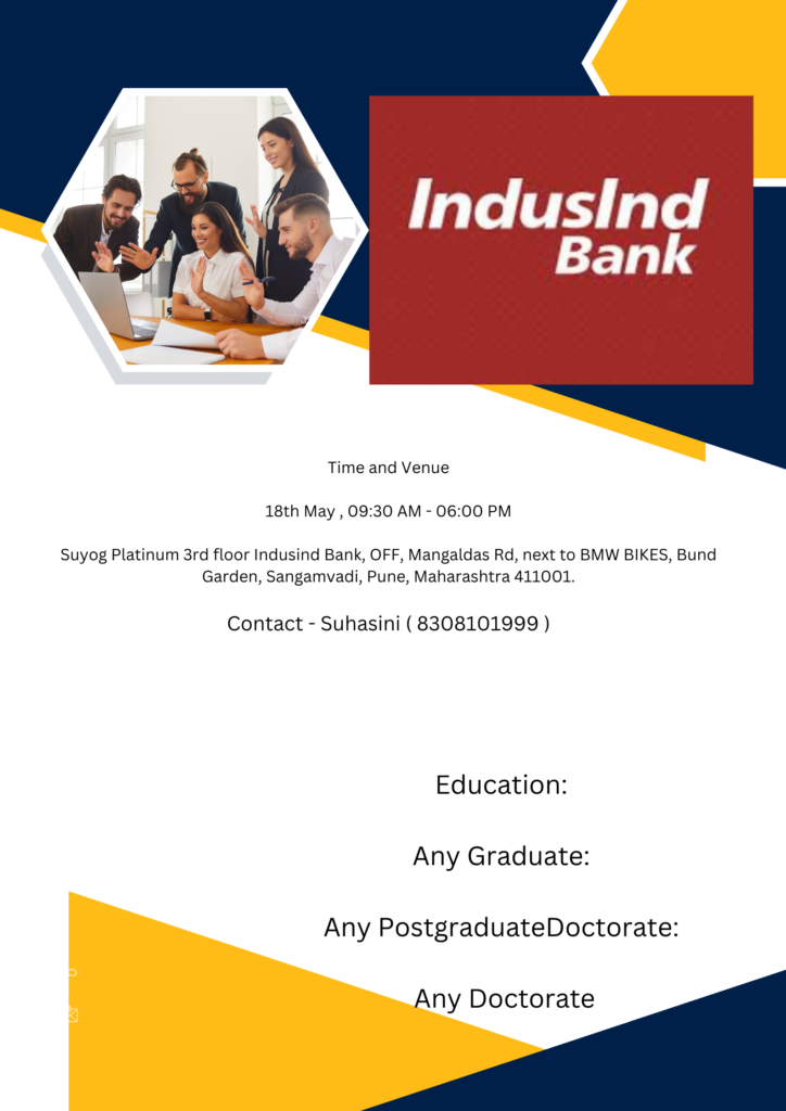IndusInd Bank Ltd. is a Customer-focused, technology-based, ISO 9001:2000 certified new generation private sector Bank with ambitious growth plan is looking for the following position.