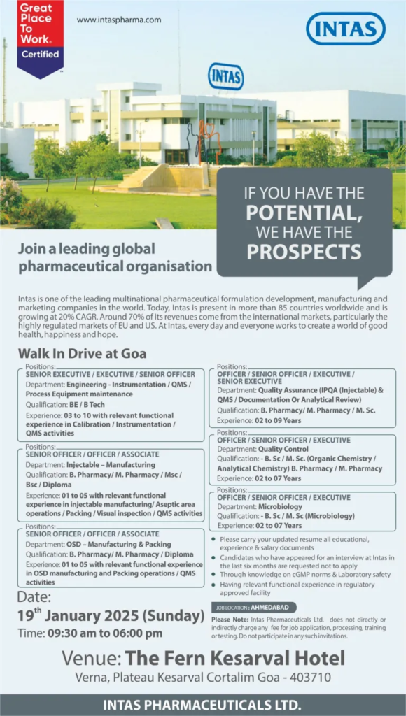 Qualification: B.Pharm / M.Pharm / MSc / BSc / Diploma