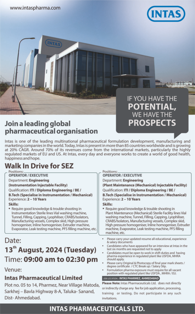 Intas Pharmaceuticals, As one of the world’s leading pharmaceutical companies, Intas is committed to fulfilling the unmet global medical needs through comprehensive, progressive and affordable medical products. To fuel its ever-expanding vision, Intas Pharmaceuticals is looking for elite professionals aiming to take their careers to the next level through the following positions.