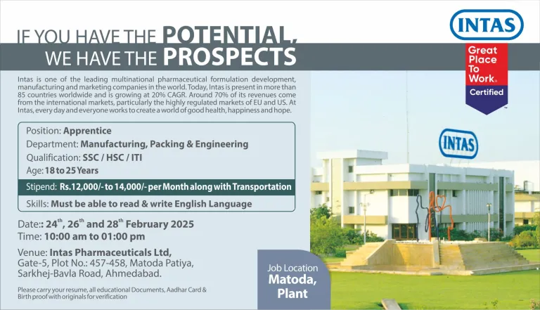 - Venue: Intas Pharmaceuticals Ltd, Matoda Plot No. 457, 458 Sarkhej Bavla Highway, Matoda Village, Sanand, Taluka, Ahmedabad, Gujarat – 382210
