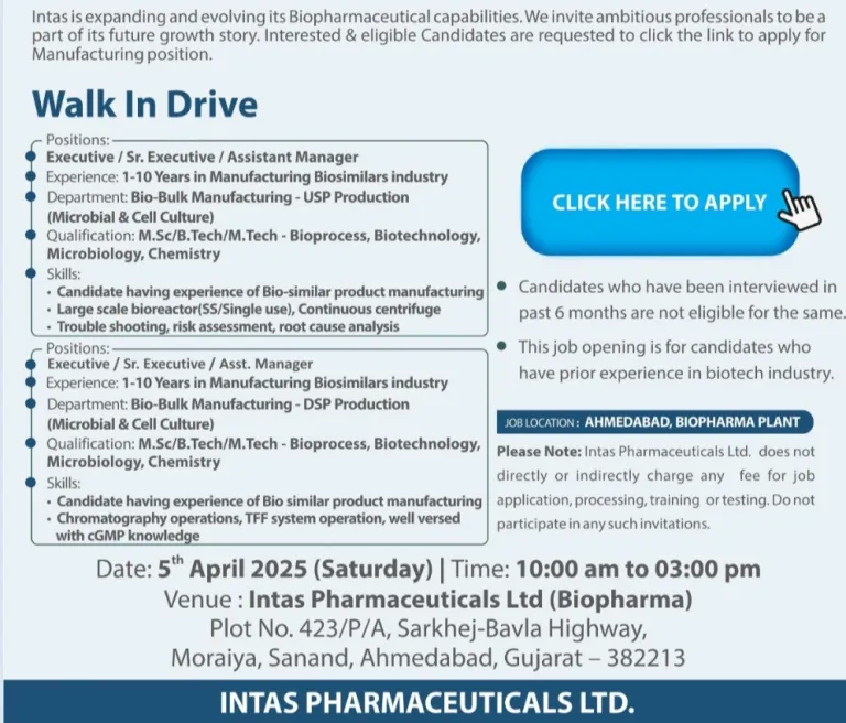 Please Note: Intas Pharmaceuticals Ltd. does not directly or indirectly charge any fee for job application, processing, training or testing. Do not participate in any such invitations.