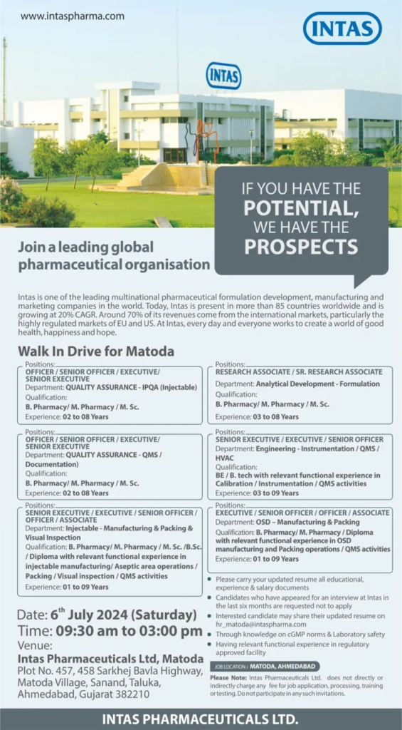 - Venue: Intas Pharmaceutical Limited, Matoda Plot No. 457, 458 Sarkehj Bavla Highway, Matoda Village, Sanand, Taluka, Ahmedabad, Gujarat – 382210.