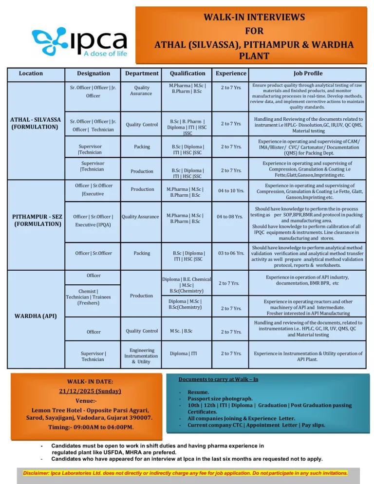 - Qualification : – B.Sc / M.Sc / B.Pharm / M.Pharm / ITI / Diploma / HSC / BE