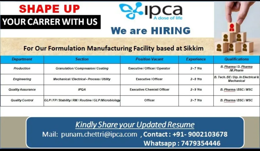 - Qualification: B.Sc, M.Sc, B.Pharm, M.Pharm, D.Pharm, B.Tech, Diploma