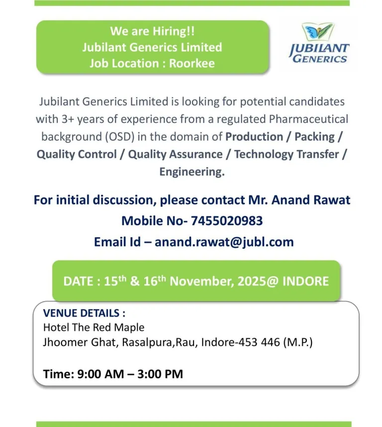 Jubilant Generics Limited is looking for potential candidates with 3+ years of experience from a regulated Pharmaceutical background (OSD) in the domain of Production / Packing /Quality Control / Quality Assurance / Technology Transfer /Engineering.