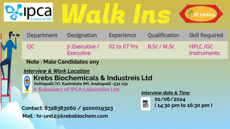 - Venue: Krebs Biochemicals & Industries Ltd (A Subsidiary of IPCA Laboratories Ltd.), Kothapalli(V), Kasimkota(M), Anakapalli -531031.