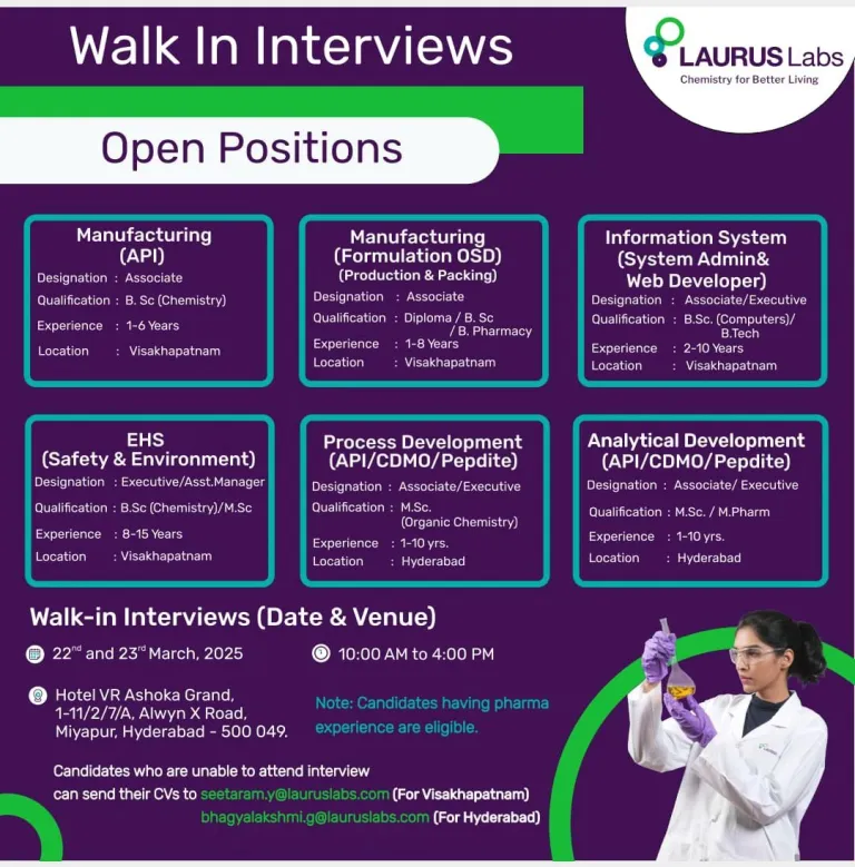 Looking for a thriving career in the pharmaceutical industry? Laurus Labs, a global leader in pharmaceutical innovation, is conducting a walk-in drive to recruit experienced professionals for multiple roles. With opportunities across Hyderabad and Visakhapatnam, this is the perfect chance to join a company renowned for chemistry-driven solutions that improve lives.