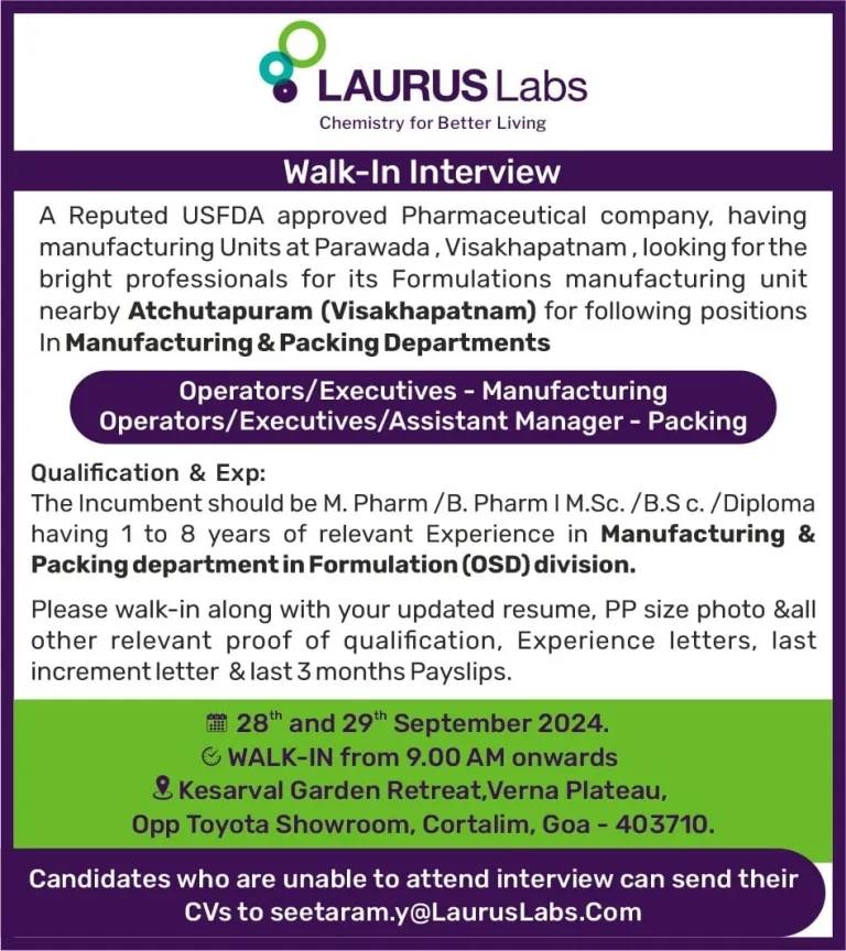 Candidates who are unable to attend interview can send their CVs to seetaram.y@lauruslabs.com