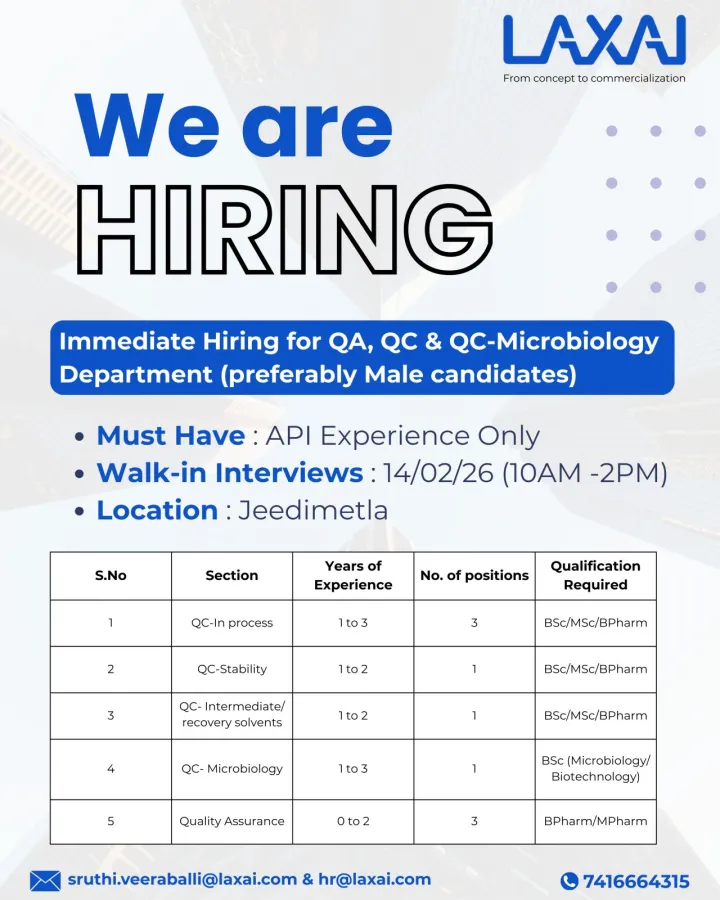 • Qualification: B.Sc / M.Sc / B.Pharm