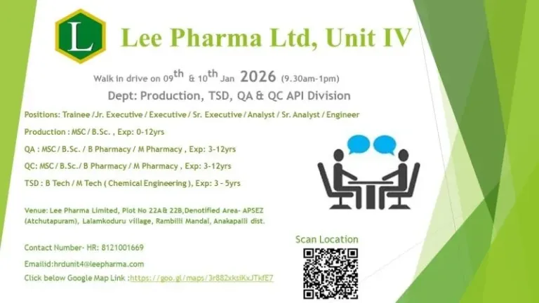 Lee Pharma Pvt.Ltd Walk-in Interview 2026.Lee Pharma Pvt.Ltd Notification full details below.Interested and eligible candidates can attend Interview on scheduled time and venue..