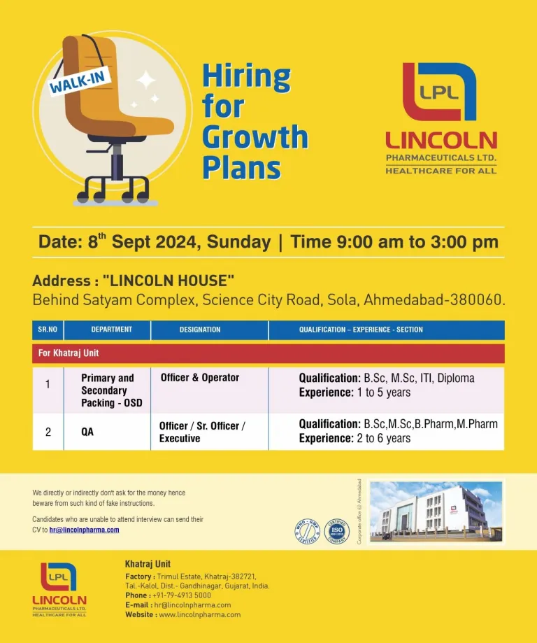 - Candidates who are unable to attend interview can send their CV to hr@lincolnpharma.com