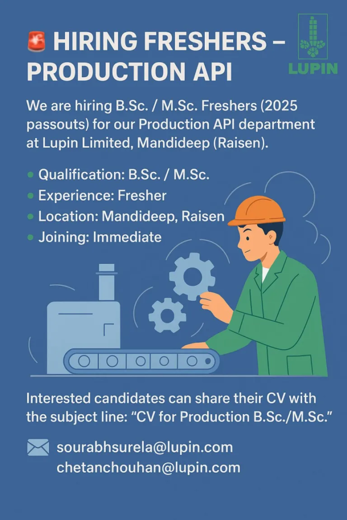 Lupin Limited, Hiring for Lupin Manufacturing Sites. Work with an Innovation-led Transnational Pharmaceutical Company. Lupin Limited is one of India’s largest manufacturers of Bulk activities and Formulations with a state-of-the-art USFDA approved formulation facilities.