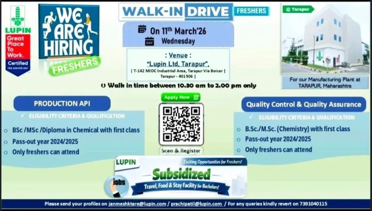 seeking freshers for API Production API and Quality Control & Quality Assurance roles.