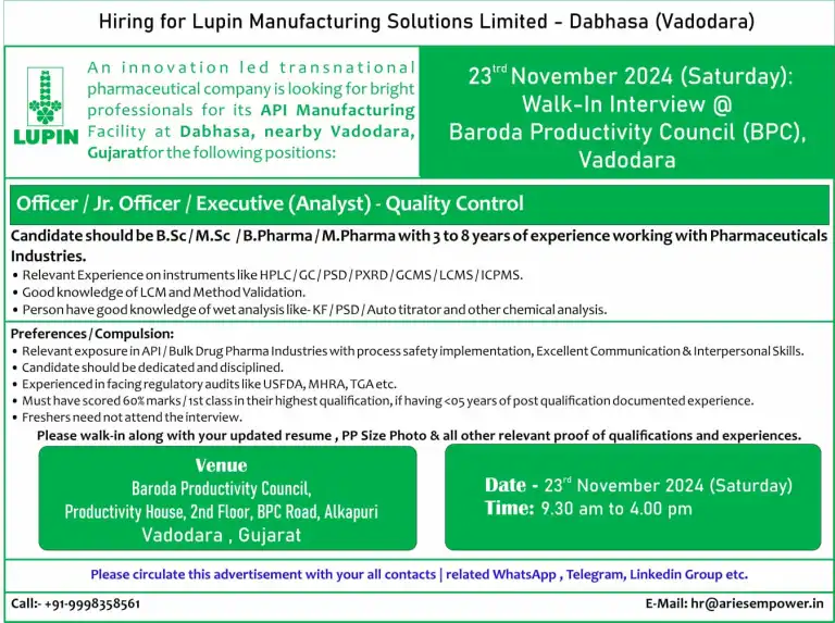 - Experience: 3–8 years in pharmaceutical industries (API/Bulk Drug preferred)