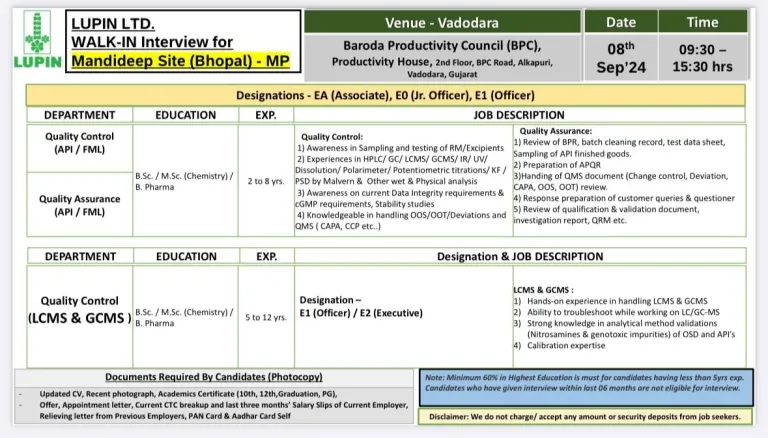 - Eligibility: B.Sc / M.Sc / B.Pharm