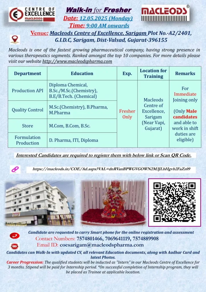 - Job Location: Macleods Centre of Excellence, Sarigam (Near Vapi, Gujarat)