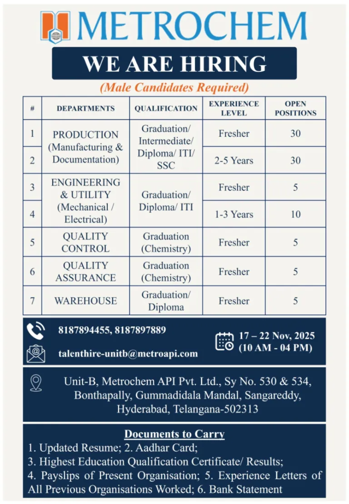 - VENUE:-Unit-B, Metrochem API Pvt. Ltd., Sy No. 530 & 534, Bonthapally, Gummadidala Mandal, Sangareddy, Hyderabad, Telangana-502313