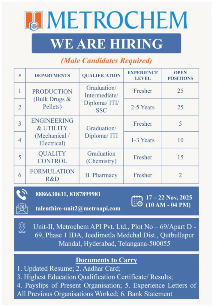 - VENUE:- Unit-II, Metrochem API Pvt. Ltd., Plot No – 69/Apart D -69, Phase 1 IDA, Jeedimetla Medchal Dist., Qutbullapur Mandal, Hyderabad, Telangana-500055