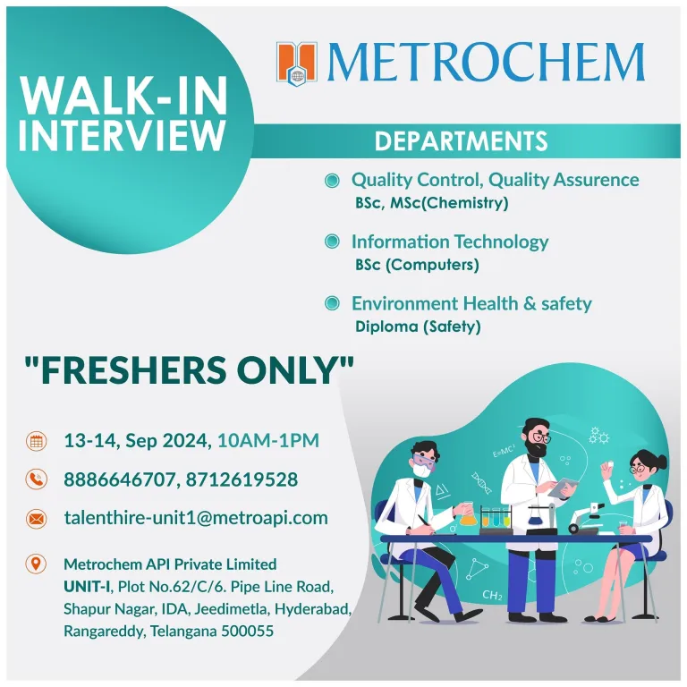- Venue: Metrochem API Private Limited UNIT-I, Plot No.62/C/6. Pipe Line Road, Shapur Nagar, IDA, Jeedimetla, Hyderabad, Rangareddy, Telangana 500055