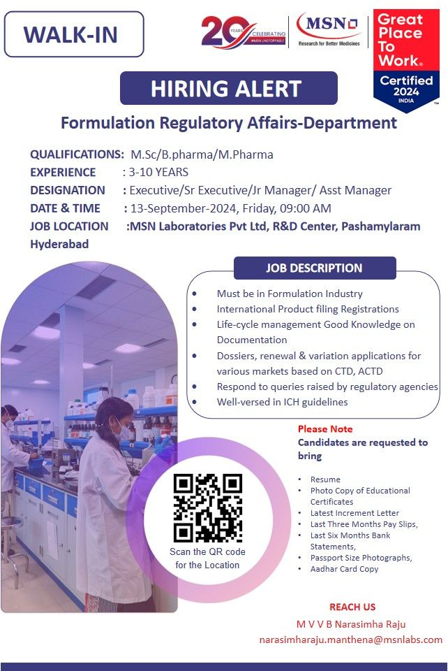 - Interview Venue: M/s MSN Laboratories Pvt. Ltd.