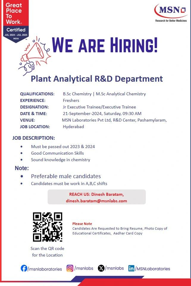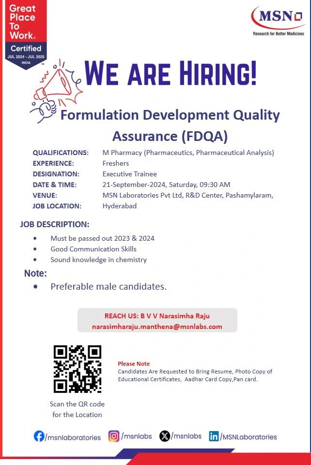 - VENUE: MSN Laboratories Pvt Ltd, R&D Center, Pasharnylaram, Hyderabad
