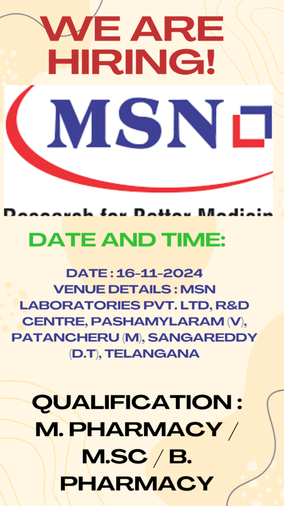 - Venue Details : MSN Laboratories Pvt. Ltd, R&D Centre, Pashamylaram (V), Patancheru (M), Sangareddy (D.t), Telangana
