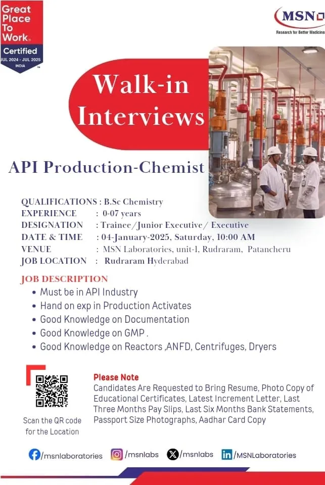 - Venue: MSN Laboratories, Unit-1, Rudraram, Patancheru