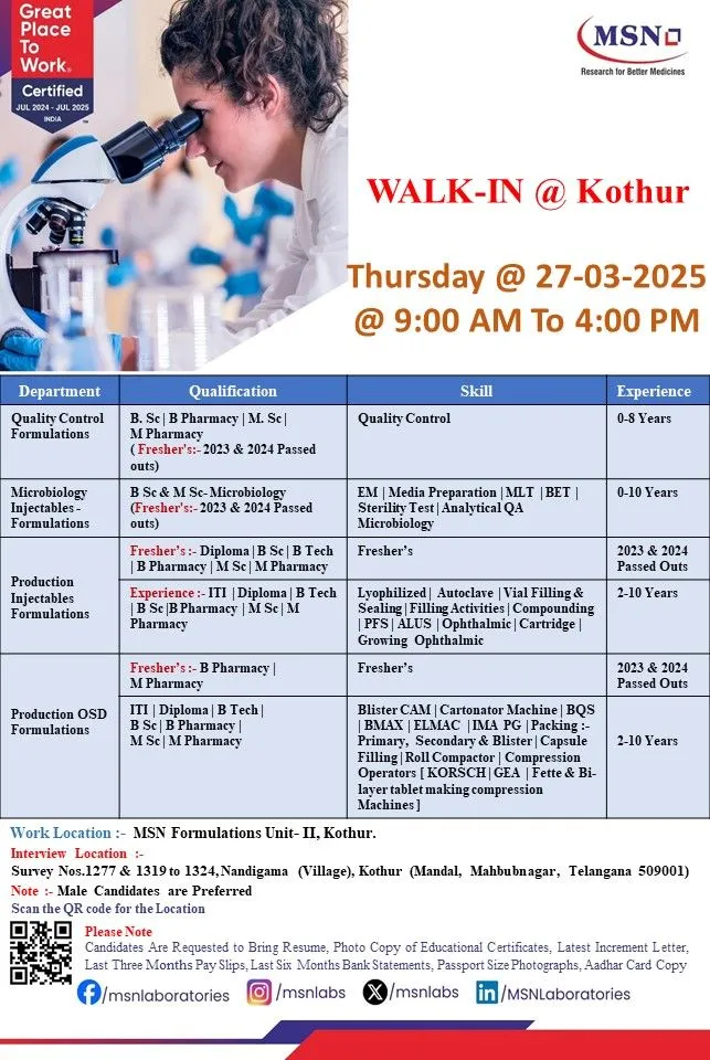About Company:- MSN Group is the fastest growing research-based pharmaceutical company based out of India. Founded in 2003 with a mission to make health care affordable, this Hyderabad-based venture has Fifteen API and Six finished dosage facilities established across India & USA. The group has an integrated R&D center for both API and formulation under one roof, dedicated to research and development of pharmaceuticals to make them more accessible. With core focus on speed and consistency in delivery