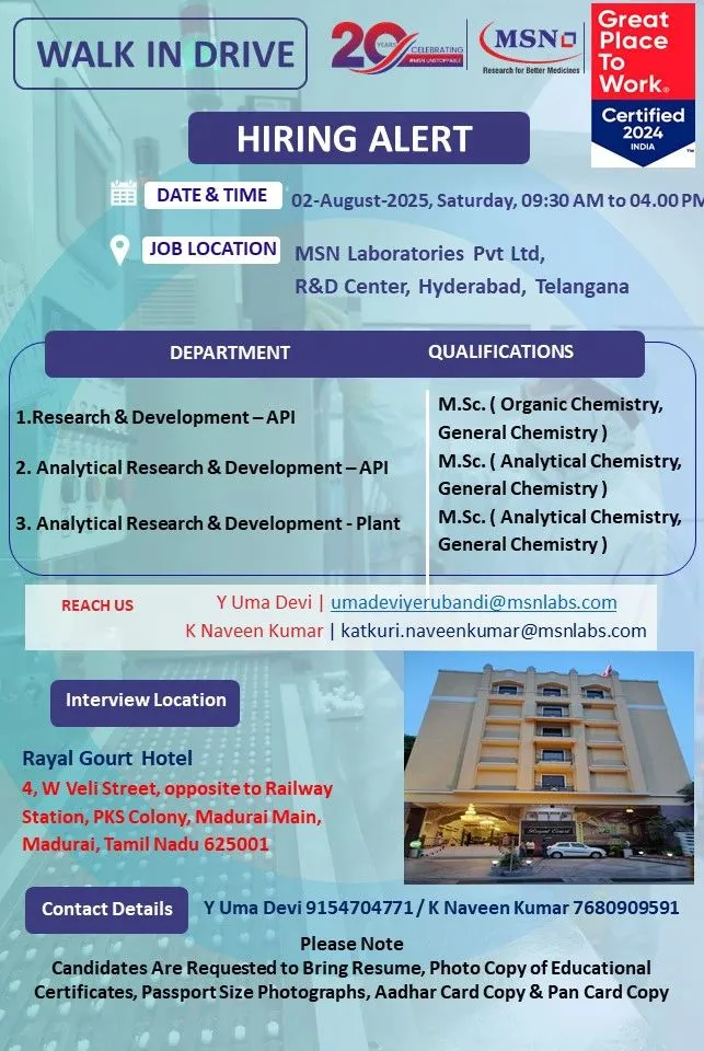 - Analytical Research & Development – API: M.Sc. (Analytical Chemistry, General Chemistry).