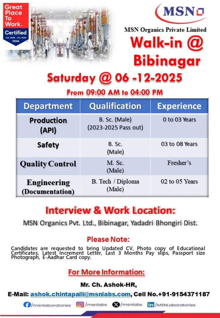 - Venue: MSN Organics Pvt. Ltd., Bibinagar, Yadadri Bhongiri District
