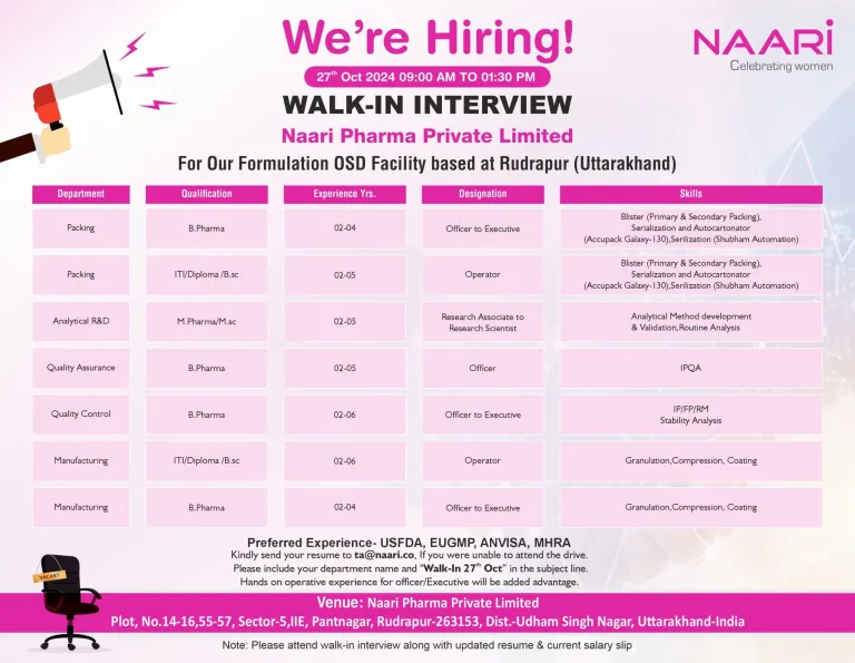 - Venue: Naari Pharma Private Limited Plot, No.14-16,55-57, Sector-5,IIE, Pantnagar, Rudrapur-263153, Dist.-Udham Singh Nagar, Uttarakhand-India.