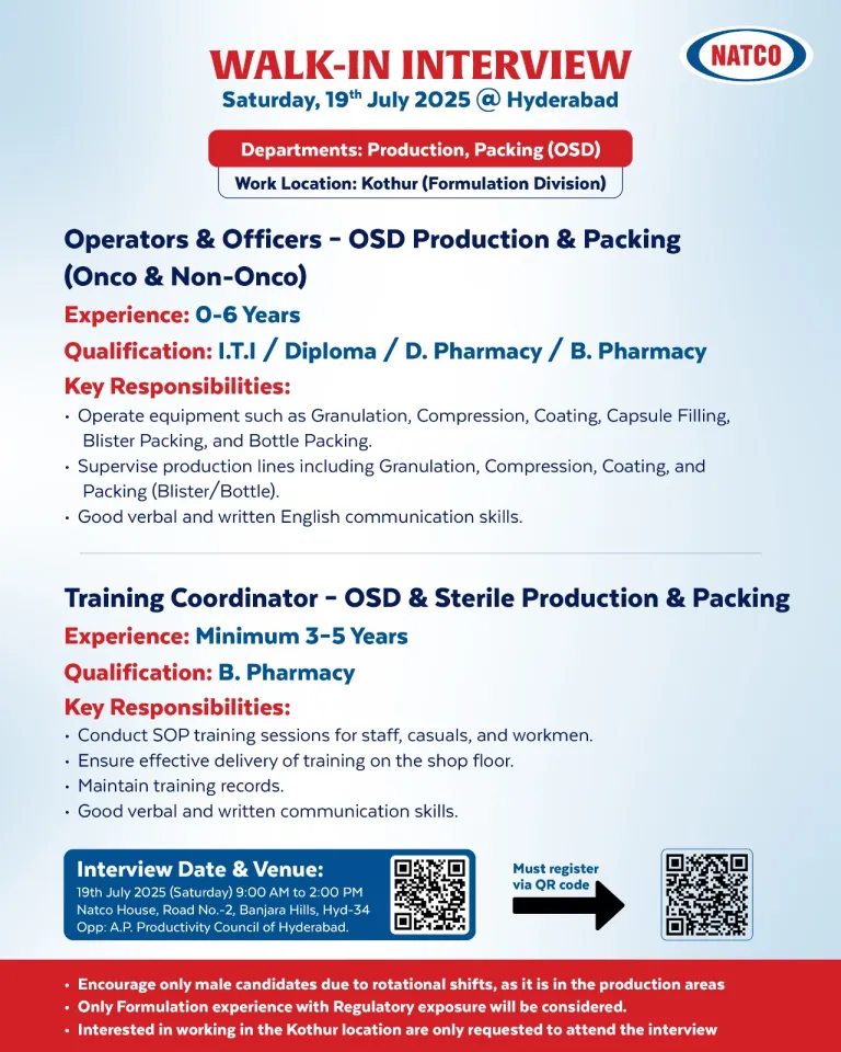 2. Training Coordinator for OSD & Sterile Production & Packing
