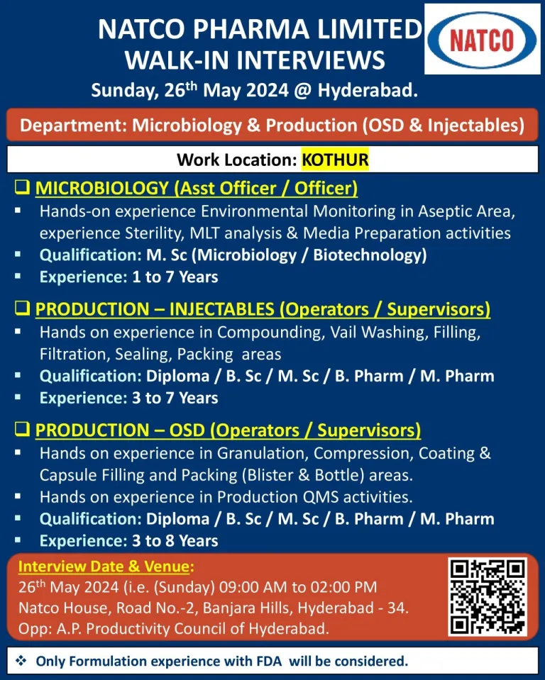 - Qualification : Diploma / B.Sc / M.Sc / B.Pharm / M.Pharm